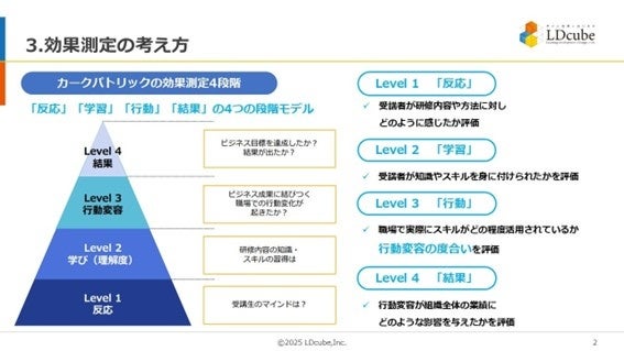 本セミナーでは、カークパトリックの4段階モデルを活用した効果測定のポイントと、