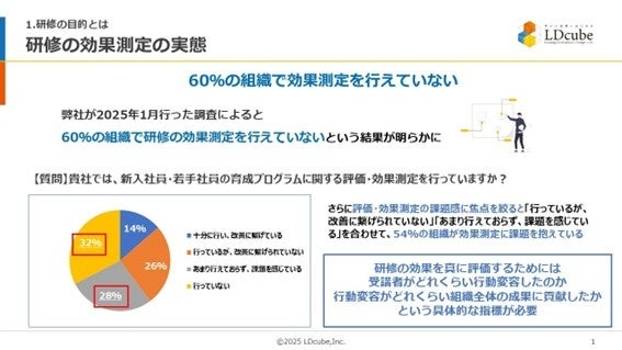 研修のスタイルにとらわれない企業向け人材育成サービスを提供する株式会社LDcube(本社:東京都千代田区、代表取締役社長:新井澄人、以下「当社」)は、「【研修の効果測定】60%の組織で行えていない"効果測定"のポイントを解説!~ツール活用で実現するノウハウを公開~」と題してウェビナーを開催しますので、お知らせします。