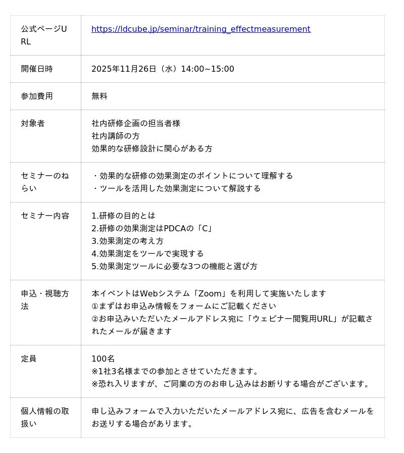 「【研修の効果測定】60%の組織で行えていない"効果測定"のポイントを解説!~ツール活用で実現するノウハウを公開~」ウェビナーを開催(11月26日14:00~15:00)株式会社LDcube