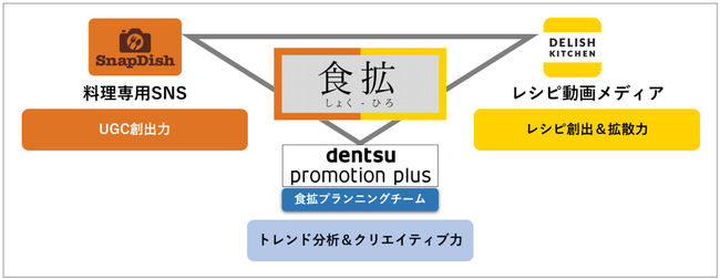 料理SNS「スナップディッシュ」を運営するスナップディッシュ株式会社(本社:東京都武蔵野市 代表:舟田 善 以下、スナップディッシュ)は、株式会社電通プロモーションプラス(本社:東京都千代田区、代表取締役社長執行役員:湯川 昌明 以下、電通プロモーションプラス)、レシピ動画メディア「DELISH KITCHEN」を運営する株式会社エブリー(本社:東京都港区 代表:吉田 大成 以下 エブリー)と協業し、ユーザーの声を起点とした「食の新体験」を創出するソリューションサービス「食拡(しょくひろ)」の提供を開始いたします。