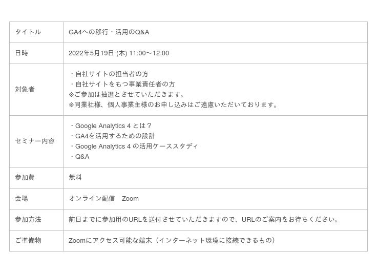 UAとGA4の違いは何か、GA4移行後どのように活用すればいいのかを解説し、質疑応答セッションで皆様の疑問を解消いたします。