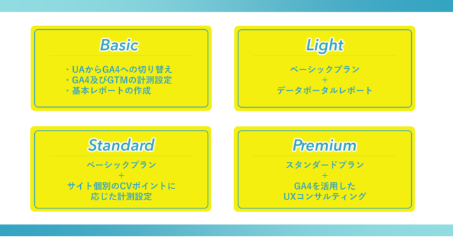 UAからGA4への切り替え、計測設定をサポートするBasicプランから、GA4を活用したUXコンサルティングまで行うPremiumプランまで、企業様のご状況やニーズに応じて4つのプランをご用意しました。