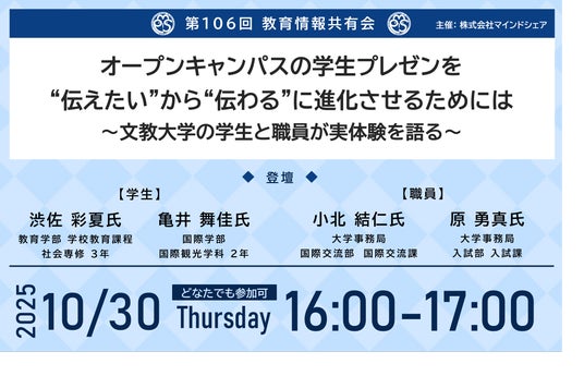 第106回となる今回は「オープンキャンパスの学生プレゼンを“伝えたい”から“伝わる”に進化させるためには~文教大学の学生と職員が実体験を語る~」というテーマにて文教大学の学生2名、職員2名に登壇いただき、教育機関の方限定で実施いたします。