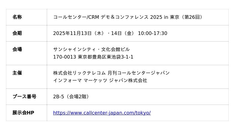 株式会社ソフトフロントホールディングス(本社:東京都千代田区、代表取締役社長:二通 宏久、以下 ソフトフロントホールディングス)ならびに、子会社である株式会社ソフトフロントジャパン(本社:東京都千代田区、代表取締役社長:高須 英司、以下 ソフトフロントジャパン)は、2025年11月13日(木)・14日(金)に開催される『コールセンター/CRM デモ&コンファレンス 2025 in 東京』にオフィシャルスポンサーとして出展します。