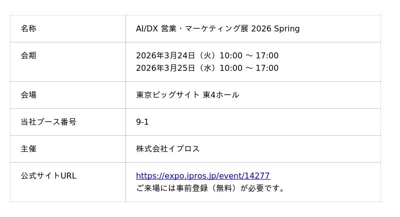 ご来場の登録はこちらAI/DX 営業・マーケティング展 2026 Spring について「AI/DX 営業・マーケティング展 2026 Spring」は、BtoBマッチングプラットフォームを運営する株式会社イプロスが開催する展示会です。営業・マーケティングにおける課題を解決するAIやDX関連のサービス・ソリューションが一堂に集結します。