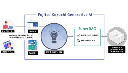 組み込みの目的 「Super RAG」は、表や図などを含む複雑な非構造ドキュメントを大量に取り込み、LLM(大規模言語モデル)による高精度な回答を生成可能にするマルチモーダル対応のAIプロダクトです。「Fujitsu Kozuchi Generative AI」は、業務システムとのシームレスな統合を可能にするWebGUI及びWebAPI群を備えており、企業が保有するデータベースやアプリケーションと簡単に接続できる富士通の先進AIサービスです。