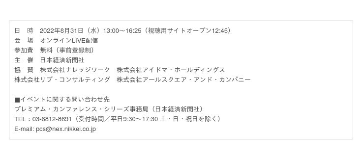 ベンチャー・中堅企業に対するグロース支援に強みを持つ株式会社リブ・コンサルティング(本社:東京都千代田区、代表取締役:関 厳)は、2022年8月31日(水)にオンライン開催される「ハイブリッド営業時代を意識したセールステック戦略」(詳細≫https://messe.nikkei.co.jp/project/pcs220831/)に登壇することをお知らせいたします。