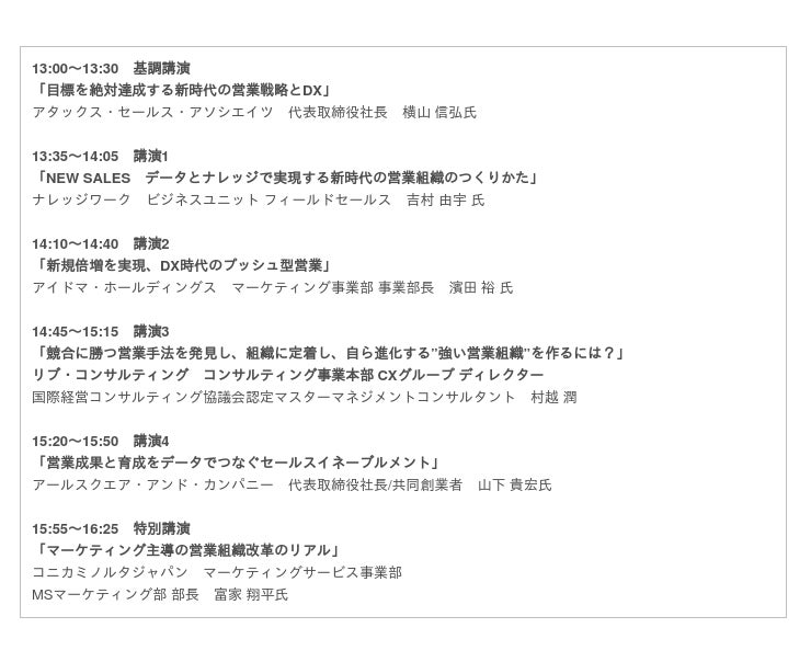 本カンファレンスではセールステックの最新情報と今後の展望、売上拡大のための具体的な戦略等について最新事例を交えてご紹介することで、トップマネジメント層・営業活動の組織全般の責任を担っているリーダー、次世代リーダーに対して自社の営業組織の課題感の再認識とツール導入検討の場といたします。