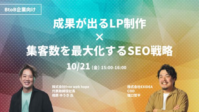 株式会社free web hope(本社:東京都千代田区、代表取締役:相原ゆうき)は、無料のオンラインセミナー「【BtoB向け】成果が出るLP制作と集客数を最大化するSEO戦略」を10月21日(金)に登壇いたします。(申し込みサイト: