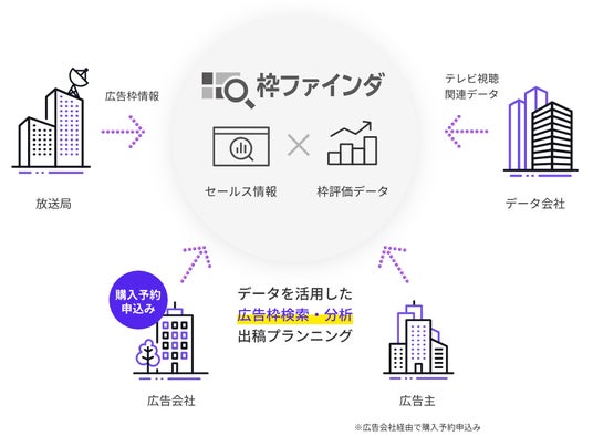 株式会社ビデオリサーチが運営する「枠ファインダ」は、放送局が提供するSASのテレビ広告枠の検索、分析から購入予約申込みまでをワンストップで行えるオンラインサービスです。運営社であるビデオリサーチのみならず、複数の企業の視聴データを提供している点を特徴とし、ユーザーは多角的な観点からテレビ広告枠の分析を行うことができます。2019年のサービス提供開始以来、現時点で放送局29局が「枠ファインダ」で広告枠を販売、利用社数は広告会社と広告主を合わせて500社以上となります。