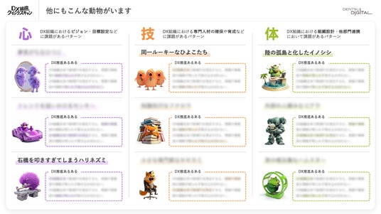 組織の「マインドセット」から「人材構成」「組織体制」「企業文化」など、DXの成功に欠かせない重要な要素を、電通デジタルが培った知見をもとに網羅的に診断します。診断ではDX組織が陥りがちな典型的な9つのパターンに分類され、組織が直面している問題を客観的に把握できます。診断結果は、組織の現状について動物をモチーフにしたレポートで提示します。