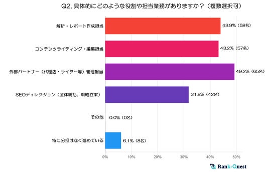 外部パートナーへの業務委託や管理に関する担当が最多となっていることから、社内のみで完結せず、代理店や外部ライターを活用する企業が多い傾向がうかがえます。