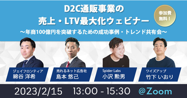 株式会社Spider Labs(東京都港区、代表取締役社長:大月 聡子、スパイダーラボズ 以下Spider Labs)は、2023年2月15日(水)13:00から「D2C通販事業の売上・LTV最大化ウェビナー~年商100億円を突破するための成功事例・トレンド共有会~」と題し、4社合同の共催ウェビナーに登壇いたします。