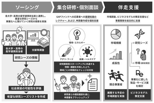 HSFC GAPファンドの対象校を訪問し、産学連携部署やURA(注2)と連携したシーズの探索・発掘を実施。優れた研究成果の情報を収集した上で、研究者へのインタビューを実施し、研究シーズのソーシングを行います。