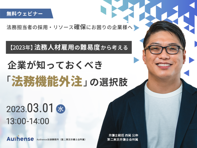 Authense法律事務所(東京都 港区)は、3月1日(水)に「【2023年】法務人材雇用の難易度から考える 企業が知っておくべき『法務機能外注』の選択肢」と題したウェビナーを開催いたします。弁護士統括として数多くの企業に弁護士のアウトソーシングをアサインしてきた西尾 公伸弁護士が、法務部に必要な機能と整えておくべき「法務体制」について解説します。