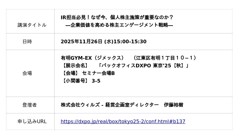 株式会社ウィルズ【日時】 2025年11月26日 (水)15:00-15:30 【会場】有明GYM-EX(ジメックス) (江東区有明1丁目10−1)