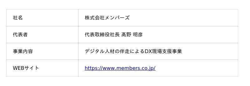 株式会社メンバーズについて「DX現場支援で顧客と共に社会変革をリードする」を掲げ、デジタル人材の伴走による企業へのDX現場支援事業を展開。高い専門スキルを持つデジタル人材が取引先企業のチームの一員として、上位戦略を理解し実行に落とし込みながら、現場での内製によるDX推進を伴走支援し、取引先企業のDX投資のROI最大化に貢献します。1995年設立。東証プライム上場。