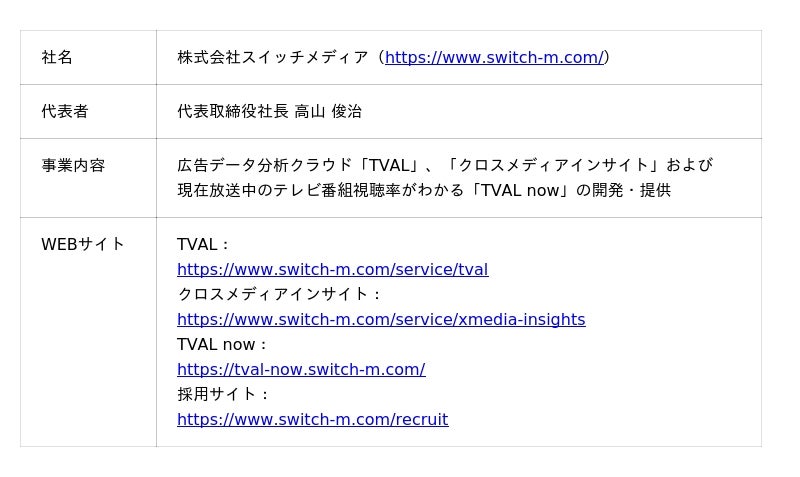 スイッチメディアについて株式会社スイッチメディアは、テレビCM+デジタル広告の出稿データを統一指標で一元管理し、過去比較やブランド横断分析を通じてメディア予算アロケーションを支援するSaaSプロダクト「クロスメディアインサイト」、また国内最大規模のテレビ視聴パネルから取得したテレビCM接触データとインテージ社の購買データ(SCI(R))をシングルソースで連携させ、テレビCMの売上効果の分析を実現するSaaSプロダクト「TVAL」の開発・運営を行っています。