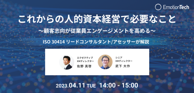 株式会社エモーションテック(東京都港区、代表取締役 今西良光)は、2023年4月11日(火)にオンラインセミナー「これからの人的資本経営で必要なこと ~顧客志向が従業員エンゲージメントを高める~」を開催致します。