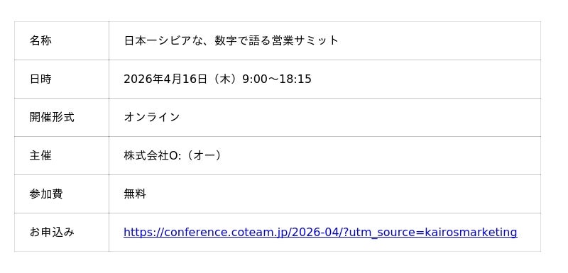 “次の一手”がデータでわかるMA+SFA一体型ツール「Kairos3(カイロススリー)」を提供するカイロスマーケティング株式会社(本社:東京都渋谷区、代表取締役:佐宗 大介、以下「当社」)は、株式会社O:(オー)が主催するオンラインカンファレンス「日本一シビアな、数字で語る営業サミット」に、当社取締役 COO 白井 則行が登壇することをお知らせします。