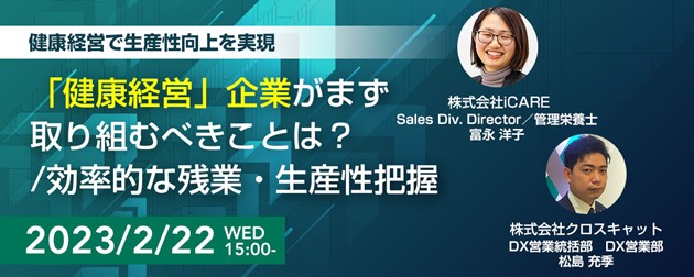 株式会社クロスキャットは、企業向けクラウド健康管理システム「Carely(ケアリィ)」を提供する株式会社iCAREと協力し、2月22日(水)15時、人事総務部門、経営企画部門などのご担当者向けに共同Webセミナー「健康経営で生産性向上を実現『健康経営』企業がまず取り組むべきことは?効率的な残業・生産性把握」を開催いたします。