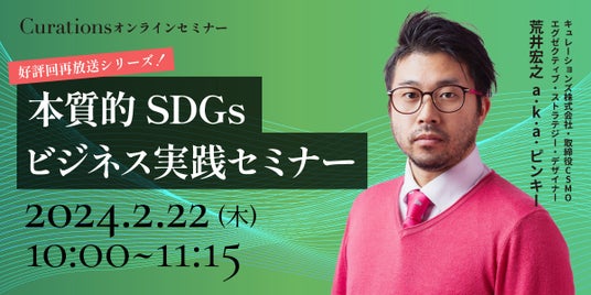 顧客企業のビジネス変革を成功に導くキュレーションズ株式会社(本社:東京都渋谷区、代表取締役社長:根本隆之、以下当社)は、『本質的SDGsビジネス実践セミナー(好評回再放送シリーズ!)』を2024年2月22日(木)に開催いたします。