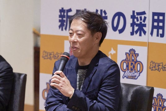 最初に「現状の採用課題と新たな取り組みについて」をテーマに、学生の意見も交えたトークディスカッションが行われました。就職先選びの新たな視点として、Z世代の学生たちが共感できる社長のビジョンや魅力を重視する試みで「MY CEO AWARD2024」で中国・四国エリアNo.1に輝いた株式会社広島ドラゴンフライズの浦伸嘉社長(広島・プロバスケットボールチーム運営)、BEST100に選ばれた合同会社SISTERの清水純子代表(岡山・サービス)が登壇しました。