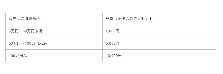 キャンペーン期間中に販売所で日本円建てで5万円以上*1の取引をされたお客様にキャンペーン期間中の販売所の取引総額に応じて最大1万円が当たります。