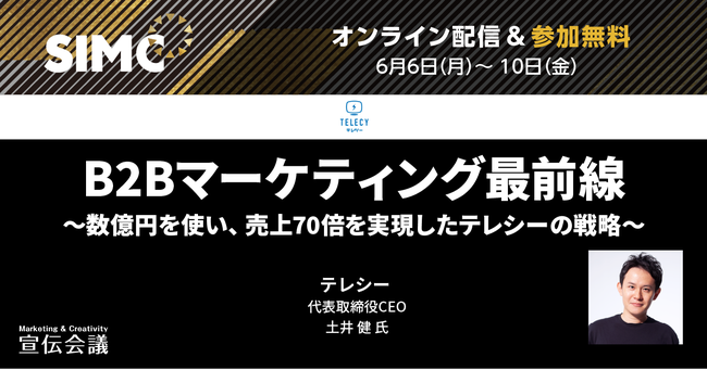 https://telecy.tv/)を運営する株式会社テレシー(東京都渋谷区、代表取締役CEO:土井 健)は、株式会社宣伝会議(東京都港区、代表取締役会長:東 英弥)が2022年6月6日(月)から6月10日(金)までの5日間に渡って開催する、『SIMC』に協賛いたします。