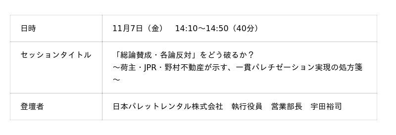 2日間にわたるイベントのDay1となる11月7日は、特別企画「物流の針路をいま、共に創る」。JPRは、物流業界で関心の高まるパレットに関するセッションに登壇します。