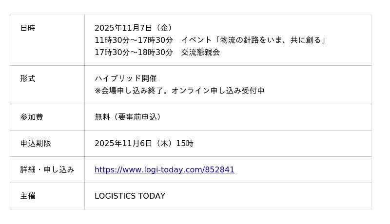 日本パレットレンタル株式会社(東京都千代田区 代表取締役社長 二村篤志 以下、JPR)は、2025年 11月7日(金)に開催される「『LOGI NEXT 25』 産官学オールジャパンで挑む物流変革」(主催:LOGISTICS TODAY)に登壇します。