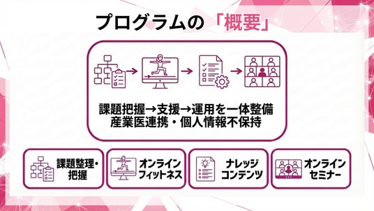 オンラインフィットネス、ナレッジコンテンツ、オンラインセミナーを組み合わせて支援する実装型のプログラムです。
