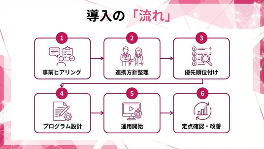 初回の情報交換では、課題整理の観点、優先順位付け、提供メニューの組み合わせ例、運用設計(周知・参加導線・継続設計)のたたき台まで提示します。