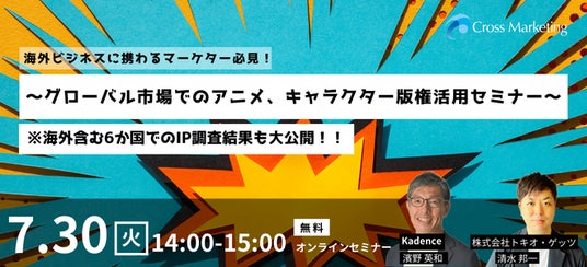 エンタメコンテンツビジネスを手掛ける株式会社トキオ・ゲッツ(本社:東京都新宿区、代表取締役社長:小笠原 亨、以下トキオ・ゲッツ)と、世界99カ国に調査ネットワーク、10カ国に調査拠点を持ち、海外調査に豊富な知見を持つKadence International (Thailand) Co., Ltd.(本社:タイ・バンコク、代表:濱野 英和、以下Kadence)のクロス・マーケティンググループのグループ2社は、共同でセミナーを実施いたします。