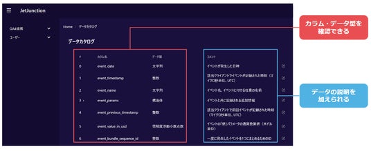 今回のデータカタログ機能の追加でJetJunctionの管理画面上でカラム名および説明を確認できるようになり、データのレイアウトの設定が簡単に行えるようになりました。さらに、複数のカスタムサマリを作成する場合や複数のメンバーで設定・変更する場合に、データを正しく理解したうえでの作業が可能となり、データの品質を担保できるようになりました。