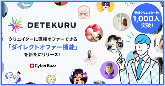 ソーシャルメディアマーケティング事業を展開する株式会社サイバー・バズ(本社:東京都渋谷区、代表取締役社長:高村 彰典)は、企業とクリエイターのマッチングプラットフォーム「DETEKURU」が、登録クリエイター数が1,000人を突破したことをお知らせいたします。(2024年7月15日時点)また、DETEKURU内で、直接好きなクリエイターにチャットでオファーできるダイレクトオファー機能を新たにリリースいたしました。