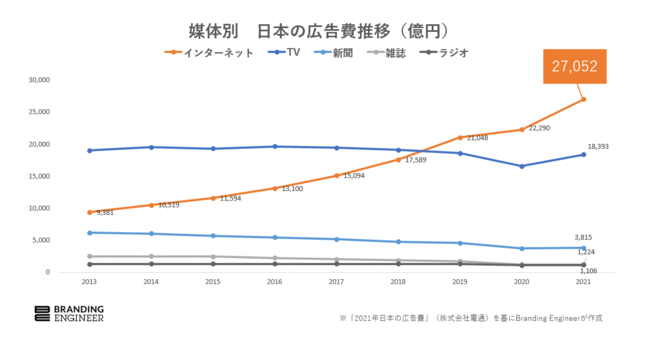 先日、株式会社電通が発表した、日本の総広告費および媒体別、業種別の広告費を推定した「2021年 日本の広告費」では、インターネット広告費がマスコミ四媒体(新聞・雑誌・ラジオ・テレビメディア)広告費を初めて上回ったと発表されました。