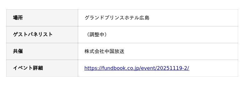 M&A仲介を行う株式会社fundbook(本社:東京都港区、代表取締役: 渡邊和久、読み:ファンドブック、以下「当社」)は、成長戦略と地域経済活性化について解説する無料セミナーを2025年10月から5都市で、各開催地域の放送局と連携し開催いたします。