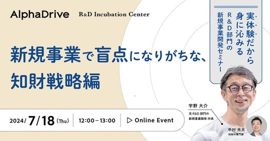 本サービスの始動に当たり、「新規事業で盲点になりがちな、知財戦略 ~”実体験”だから身に沁みる R&D部門の新規事業開発セミナー~」というテーマで7月18日にセミナーを開催します。