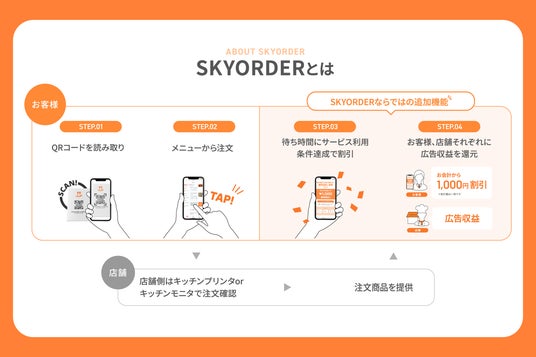 飲食店に来店されたお客様は、スマートフォンからいつでも注文できるだけでなく、『SKYORDER』に表示されたサービスを体験することで、当日のお会計から割引を受けることができます。また、お客様に割引を提供すると同時に、飲食店にも広告収益が入るモデルとなっています。