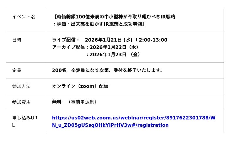 【時価総額100億未満の中小型株が今取り組むべきIR戦略 :株価・出来高を動かすIR施策と成功事例 】と題したオンラインセミナーを実施いたします。