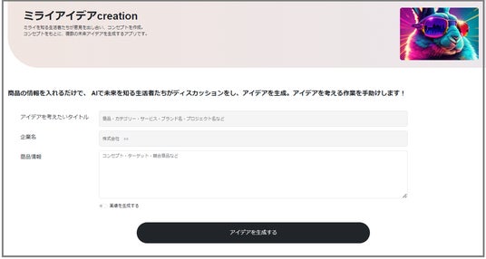 株式会社 読売広告社(本社:東京都港区 代表取締役社長:菊地英之 以下、YOMIKO)は、独自AIの力を活かし、新しい企画の創出を支援するアイデア創造アプリケーション「ミライアイデアcreation」を開発。このアプリケーションは、当社が広告主に行うマーケティング支援を目的に開発をしました。社内のブレインストーミング時など、幅広くアイデアのヒントが必要な時に活用を想定しています。生成AIから出力されるミライアイデアから着想を得て、当社グループ社員が持つ知見やノウハウを活用して企画化することで、更なる独自性と実効性のあるアイデアを生み出し、広告主のブランドイメージや売上げ向上に寄与してまいります。