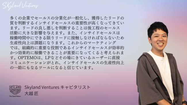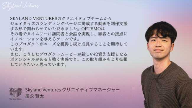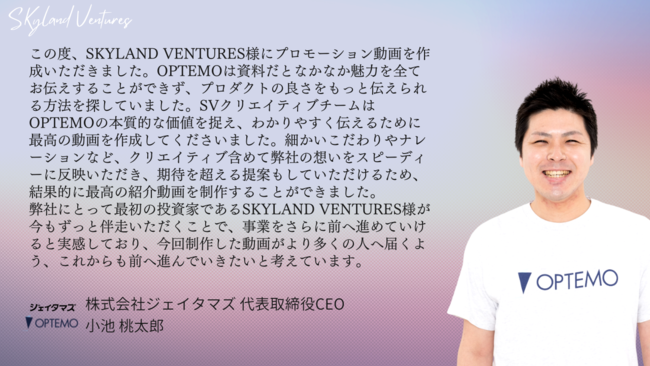 Skyland Ventures(本社:東京都渋谷区、パートナー・CEO:木下慶彦、以下SV)は、株式会社ジェイタマズ(東京都千代田区、代表取締役CEO:小池桃太郎、以下「ジェイタマズ」)が運営するインサイドセールス向けSaaS 『OPTEMO』の正式リリースに伴い、プロダクトプロモーション動画を制作支援いたしました。