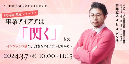 顧客企業のビジネス変革を成功に導くキュレーションズ株式会社(本社:東京都渋谷区、代表取締役社長:根本隆之、以下当社)は、『事業アイデアは「閃く」もの~インプットの量が、良質なアイデアへと繋がる~(好評回再放送シリーズ!)』を2024年3月7日(木)に開催いたします。