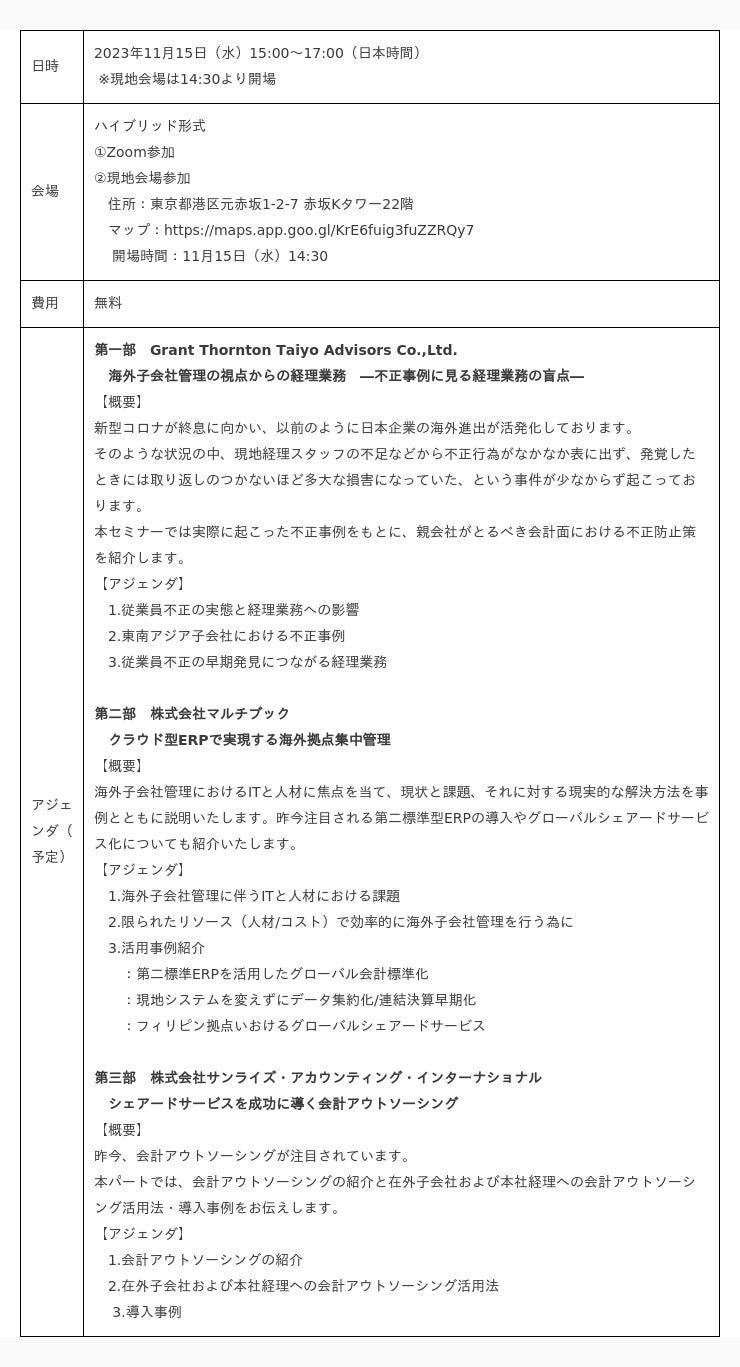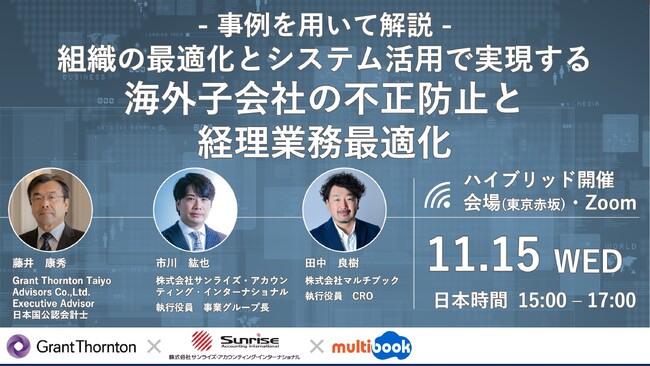 海外拠点を持つ企業の経営管理を支援するクラウドERPサービス「multibook(マルチブック)」を提供する株式会社マルチブック(東京都品川区、代表取締役CEO:渡部 学)は、Grant Thornton Taiyo Advisors Co.,Ltd.(東京都港区、代表取締役:梶川 融)、株式会社サンライズ・アカウンティング・インターナショナル(東京都港区、代表取締役社長:久保田 昭)と共同で、海外子会社 経理部門の体制構築について専門家が人材面・システム面で対策できることを、実際の企業様の事例も交えながらお話しします。