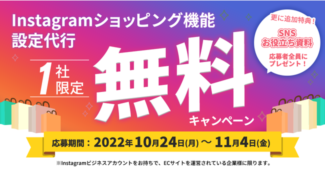 そこで、ご応募いただいた企業様の中から1社を対象にInstagramショッピング機能の設定代行を無料で提供するキャンペーンを実施いたします。