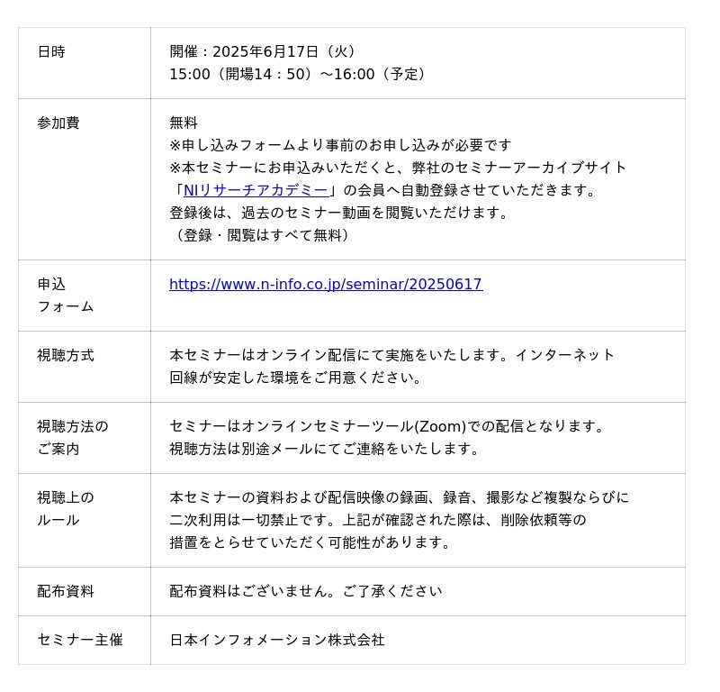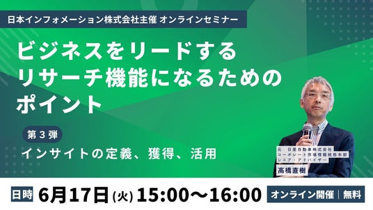 総合マーケティングリサーチ会社の日本インフォメーション株式会社(本社:東京都中央区、代表取締役社長:斎藤啓太)は、2025年6月17日(火)15:00より元日産自動車株式会社の高橋氏を講師にお迎えして、無料オンラインセミナーを開催します。
