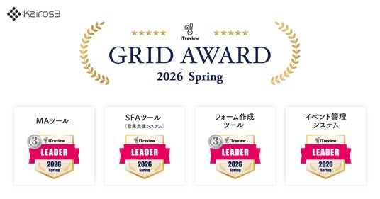 カイロスマーケティング株式会社(本社:東京都渋谷区、代表取締役:佐宗 大介、以下「当社」)が提供する、“次の一手”がデータでわかるMA+SFA一体型ツール「Kairos3(カイロススリー)」は、「ITreview Grid Award 2026 Spring」において、最高位である「Leader」を4部門にて受賞し、うち2部門では「3年連続Leader」を受賞したことをお知らせいたします。