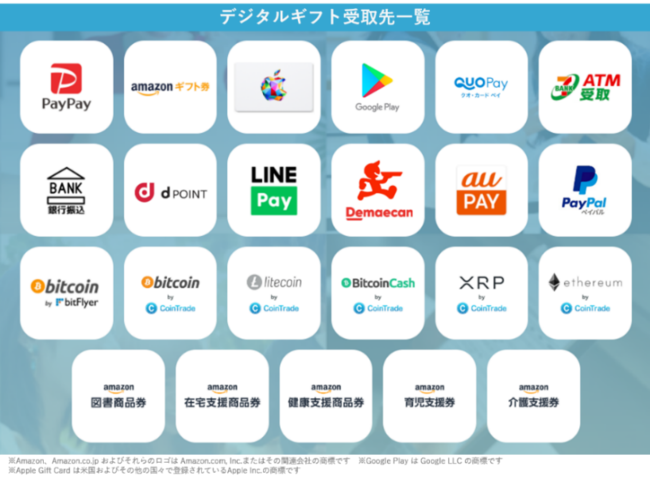 アンケート回答、資料請求、お見積もりの謝礼、社内イベントのインセンティブ、etc.