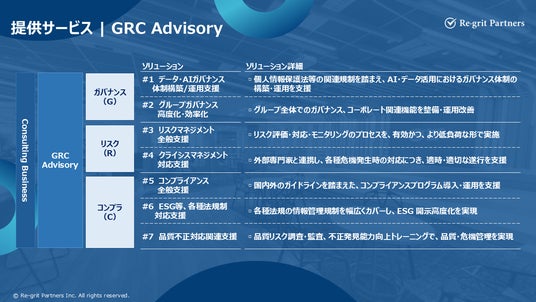 AIガバナンスをはじめ、リスクマネジメント、ガバナンス改革、法務・コンプライアンス対応、経済安全保障・地政学リスク対応等、GRC(Governance, Risk and Compliance)領域におけるコンサルティングを提供。